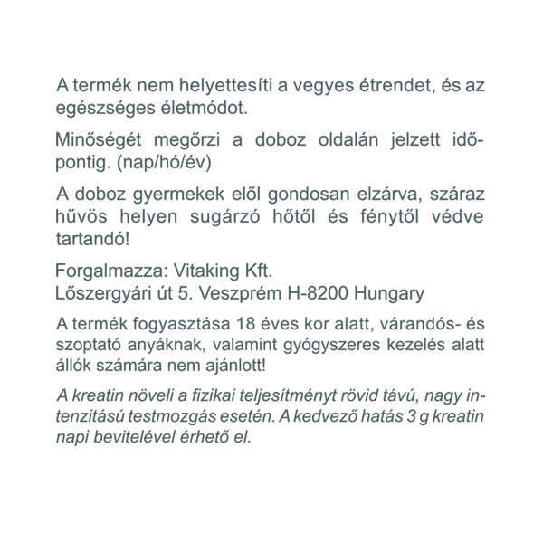 Ez a kedvező hatás 3 g kreatin napi bevitelével érhető el. Por formában igen gazdaságos választás, ugyanis 1 teáskanálnyi adag 3,4 g-ot tartalmaz.