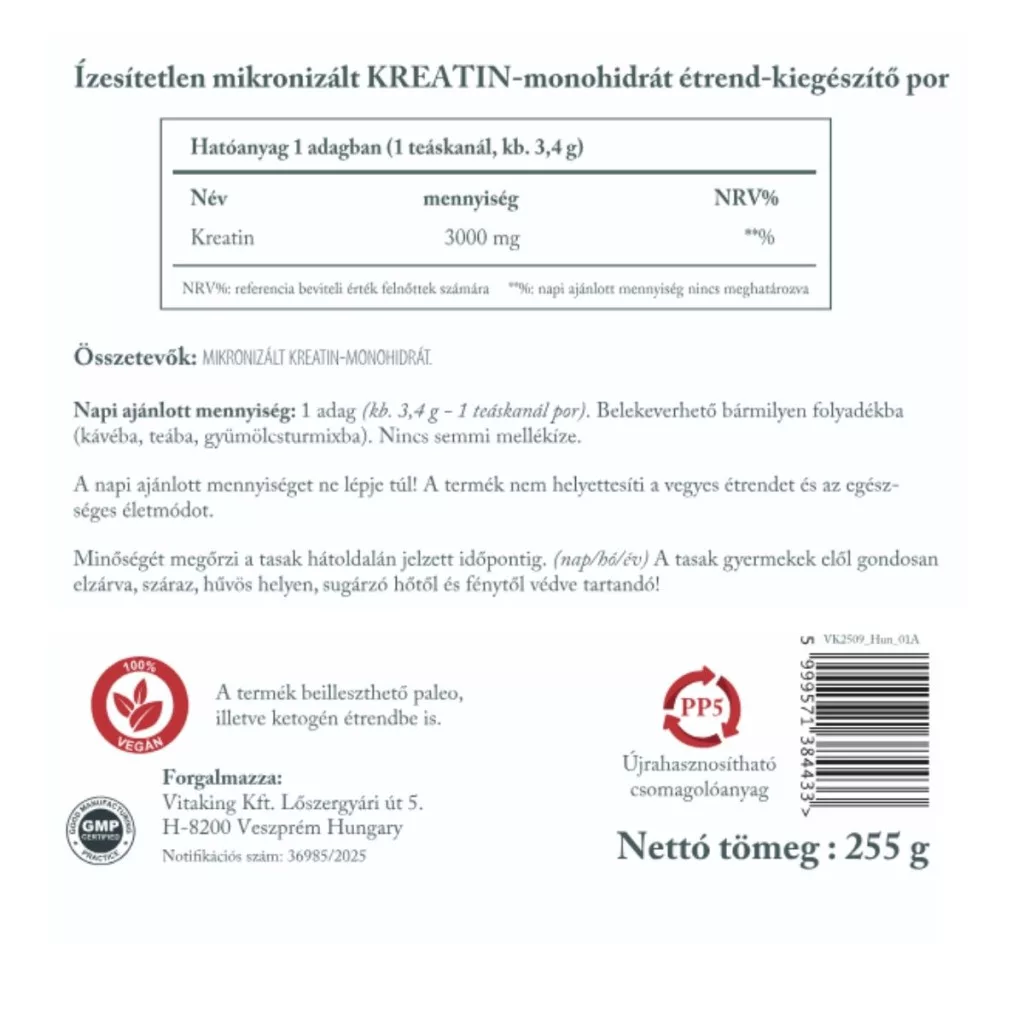Vitaking Kreatin monohidrát por 255 g (újrahasznosítható csomagolás)
