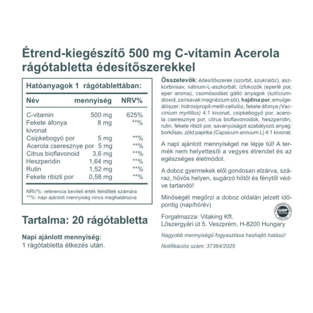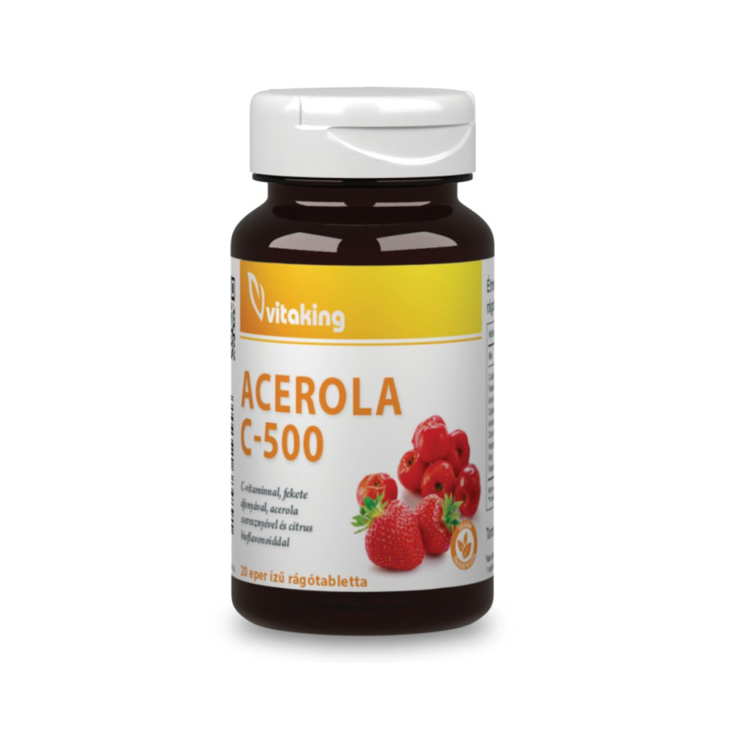 A Vitaking Acerola C-500 eper ízű rágótabletta egy finom, természetes növényi alapú C-vitamin komplex, amely 500 mg C-vitamint tartalmaz tablettánként, valamint olyan növényi összetevőket, mint az acerola cseresznye, a málna por, a hajdina por, citrus bioflavonoidok, rutin és heszperidin. Gyerekeknek és felnőtteknek kiválóan alkalmas a napi C-vitamin kiegészítésre. Élvezd a finom eper ízt, miközben tudatosan támogatod a napi vitaminbeviteledet!