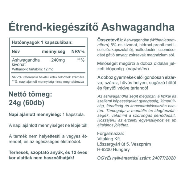 Az Ashwagandha az Ayurveda egyik legfontosabb gyógynövénye. Egyéb elnevezései: ayurvédikus ginzeng, álombogyó, téli cseresznye, Withania somnifera. Napjainkban egyre népszerűbb növény, hiszen számos előnnyel járhat a fogyasztása. Széles körben alkalmazható. A jelenlegi rohanó, felgyorsult világban nem mindig egyszerű elkerülni stresszt, a fenntartani jó hangulatunkat és energiaszintünket. Az ashwaganda egy adaptogén gyógynövény, jótékony hatással van a szervezetre szorongás és stressz esetén.