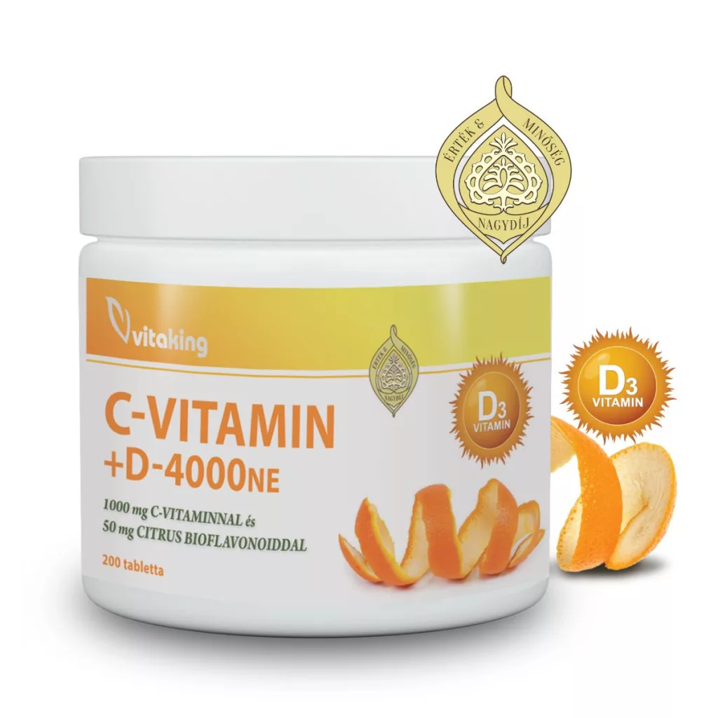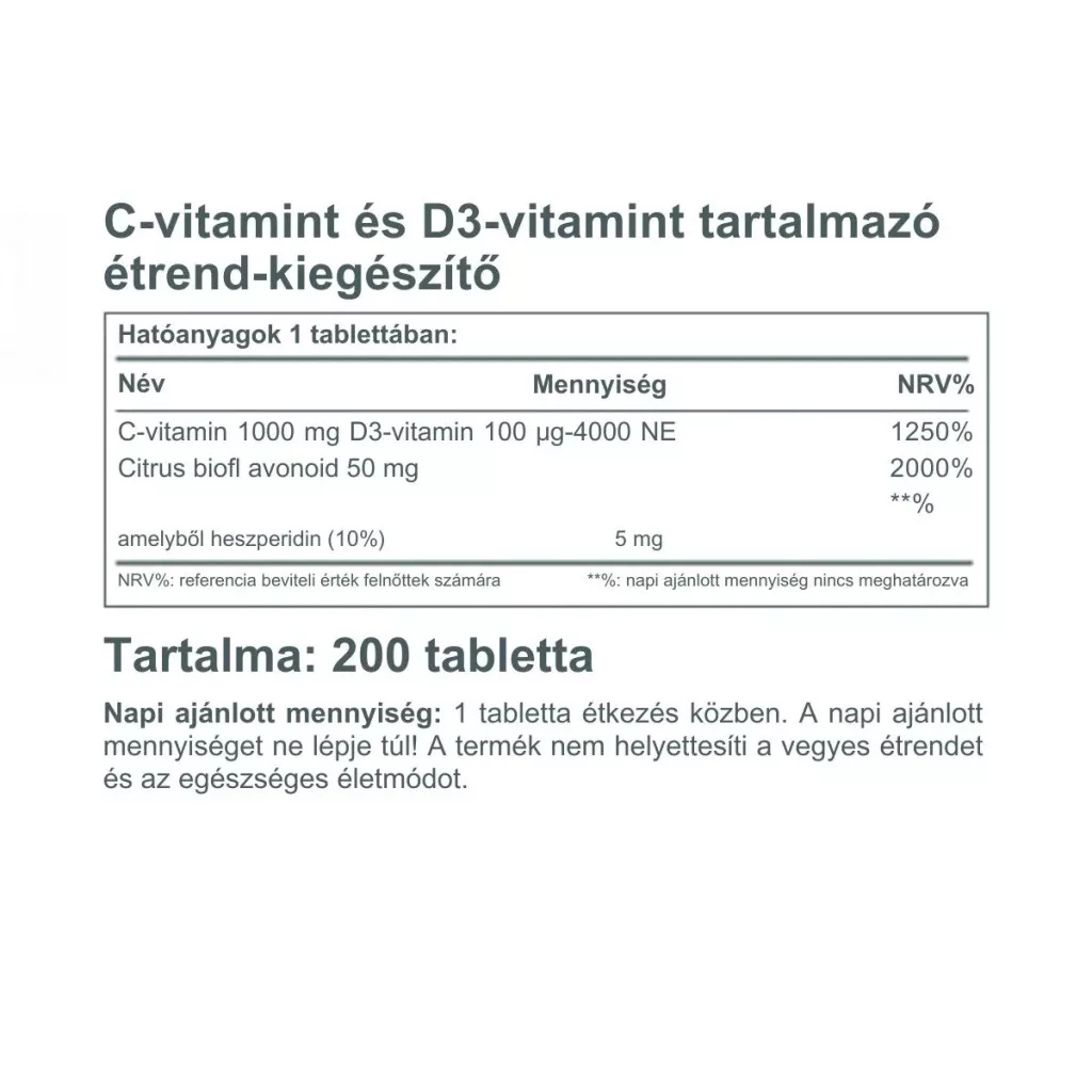 Miért vennéd meg külön külön, mikor mostantól elérhető egyben! C- és D-vitamin egy tablettában, magas hatóanyag tartalommal és extra citrus bioflavonoid kiegészítéssel! Minden egyes tabletta 1000 mg C-vitamint, 4000 NE D3 vitamint és 50 mg citrus bioflavonoidot tartalmaz.