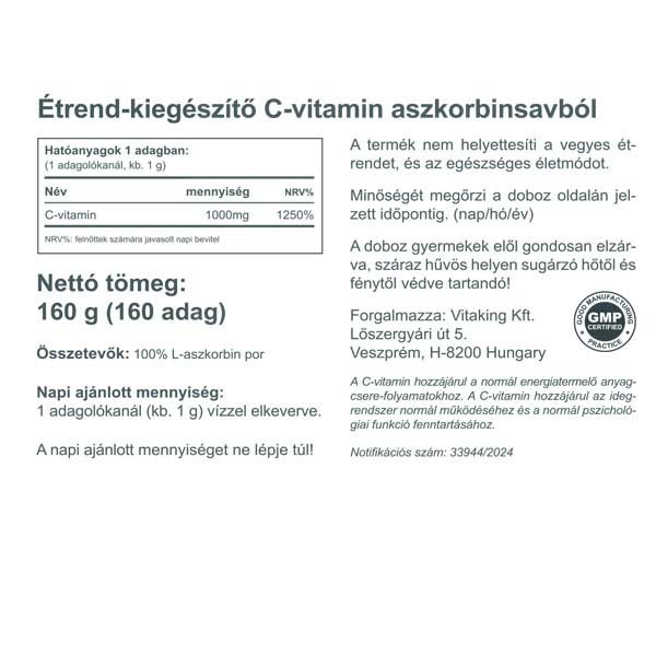 A C-vitamin (aszkorbinsav por) az egyik leggyakrabban használt vitaminforrás. A C-vitaminnak sokrétű szerepe van a szervezet működésében, függetlenül kortól, nemtől és évszaktól. Mivel vízoldékony vitamin, rendszeres bevitele nagyon fontos.