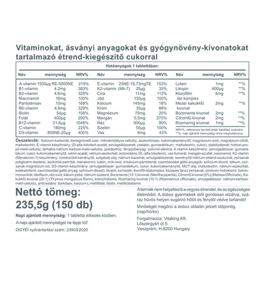 Kalcium-karbonát, tömegnövelő szer: mikrokristályos cellulóz, aszkorbinsav, kukoricakeményítő, magnézium-oxid, magnézium-citrát, maltodextrin, E-vitamin készítmény: (D-alfa-tokoferil-acetát, emulgeálószerek: zselatin, gumiarábikum, maltodextrin, cukor), stabilizátorok: hidroxi-propil-metil-cellulóz, térhálós nátrium-karboxi-metil-cellulóz, polidextróz, fényezőanyag: polivinil-alkohol, A vitamin készítmény: (emulgeálószer: gumiarábikum, cukor, kukoricakeményítő, retinil-acetát, nátrium-aszkorbát, antioxidáns: DL-alfa-tokoferol), vas-fumarát, mangán-szulfát, niacinamid, K2 vitamin (Menakinon-7) készítmény: (módosított keményítő, szójabab olaj, nátrium-kazeinát, emulgeálószerek: keményítő-nátrium-oktenil-szukcinát, zsírsavak poliglicerin észterei, aszkorbil-palmitát, menakonin), lutein, cink-oxid, d-kalcium-pantotenát, csomósodást gátló anyagok: szilícium-dioxid, talkum, zsírsavak magnézium sói, D3-vitamin készítmény