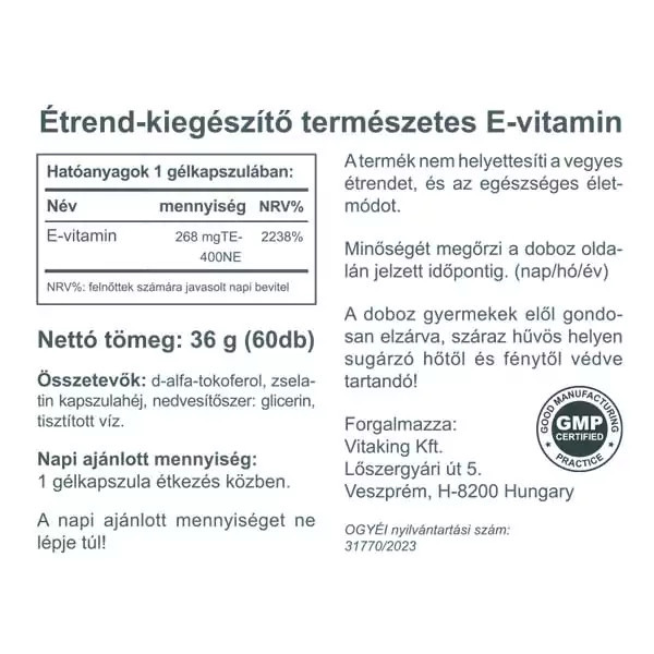 A Vitaking E-vitamin 400NE E vitamint tartalmaz. Számos kutató szerint a természetes változata (d-alpha) hatékonyabb és jobban felszívódik, mint a szintetikus (dl-alpha) változat.