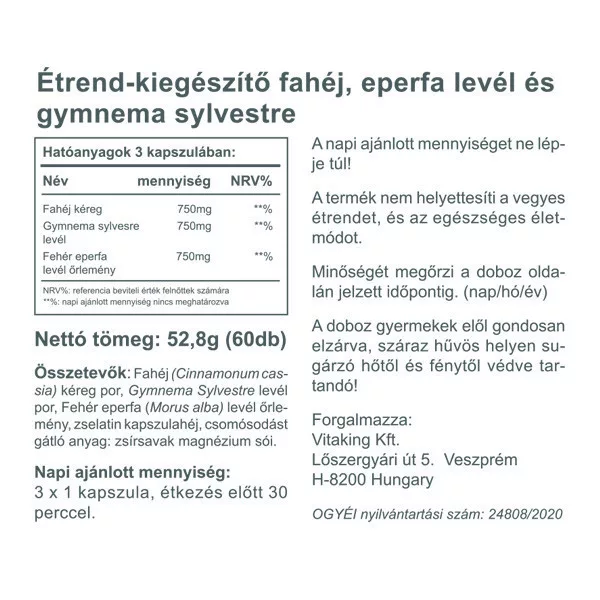 A Vitaking Gymnemax kapszula három kiváló gyógynövény keverékéből álló komplex készítmény. Ezek a gyógynövények külön-külön fogyasztva is igen jótékonyan hatnak a szervezetre, ilyen kombinációban pedig nagyon jól kiegészítik egymás hatását. A Gymnemax fahéjat, gymnema sylvestre levelet, és fehér eperfa levelet tartalmaz megfelelő kombinációban.