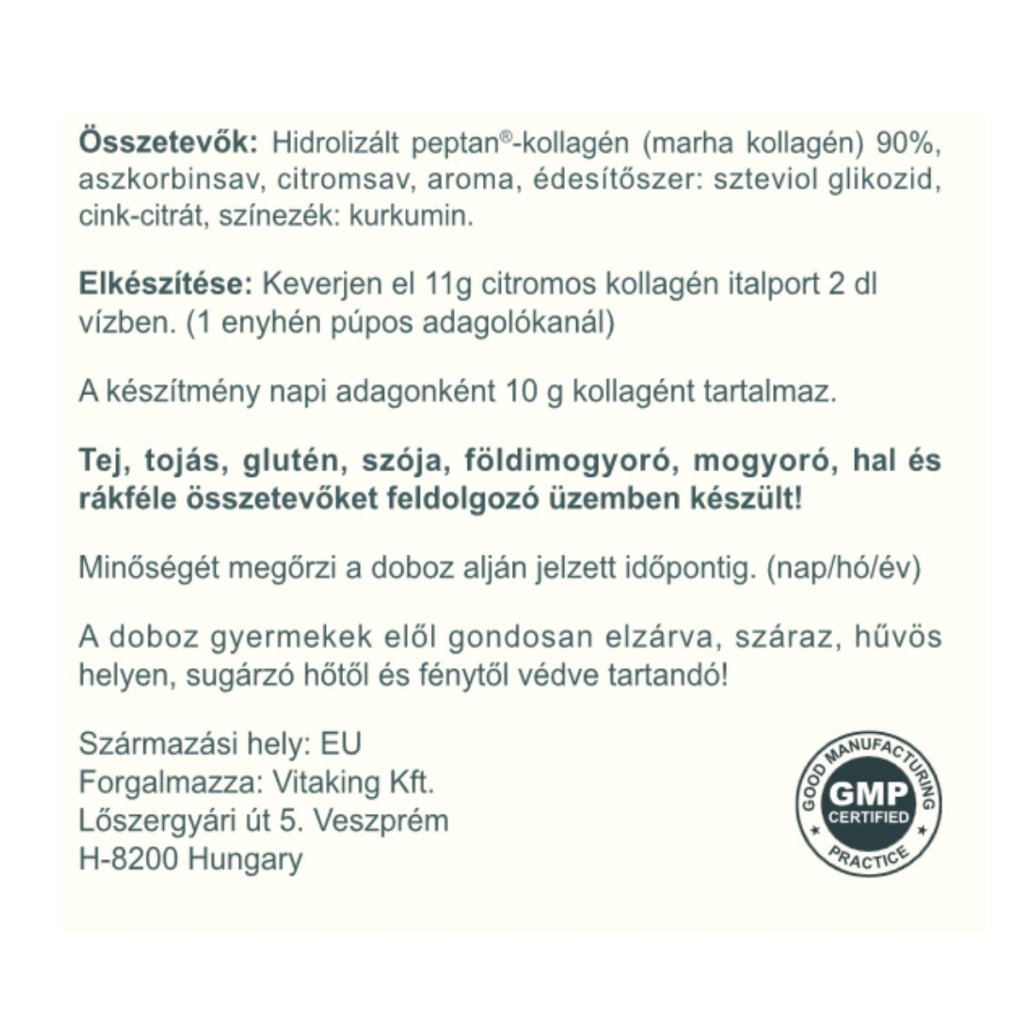 A Vitaking Citromos Kollagén nem tartalmaz hozzáadott cukrot és mesterséges édesítőszereket. Édes ízét természetes stevia kivonat adja.