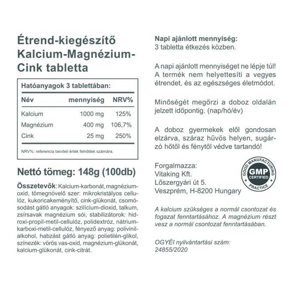 A Vitaking Kalcium–Magnézium–Cink komplex gondosan összeállított formulája napi adagonként (3 tabletta) 1000 mg kalciumot, 400 mg magnéziumot és 25 mg cinket tartalmaz – a csontok, izmok és immunrendszer támogatásáért.