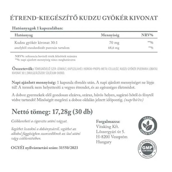 Kudzu gyökér (Pueraria Lobata) kivonat 30:1 amelyből standardizált purerain tartalom 68,6 mg |