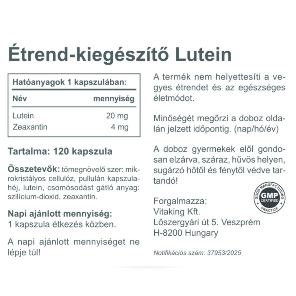 Összetevők: tömegnövelő szer: mikrokristályos cellulóz, pullulán kapszulahéj, lutein, csomósodást gátló anyag: