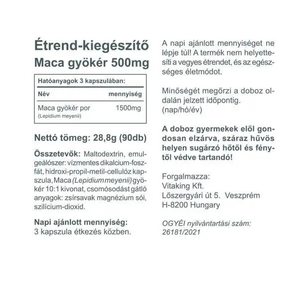 Ez a termék kapszulánként 500mg Maca gyökér port tartalmaz! Ajánlott napi adagja 3 kapszula (1500mg).