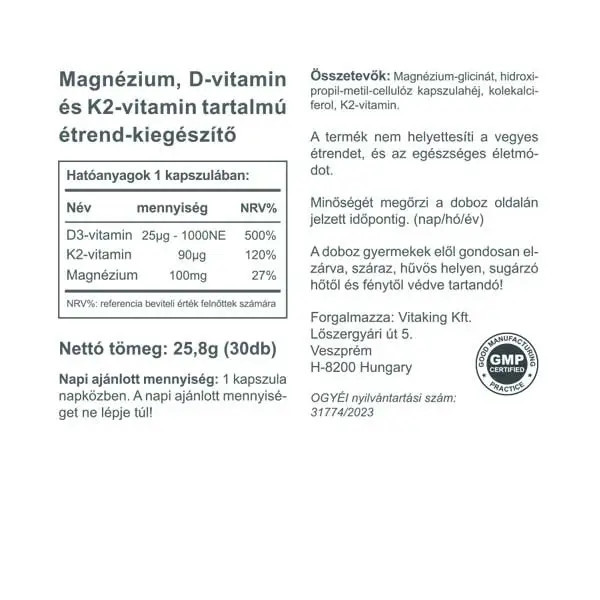 A Vitaking MagneTrio egyetlen kapszulában kiváló minőségben és nagy mennyiségben tartalmaz 3 fontos tápanyagot - magnézium biszglicinátot, K2-vitamint és D3 vitamint!