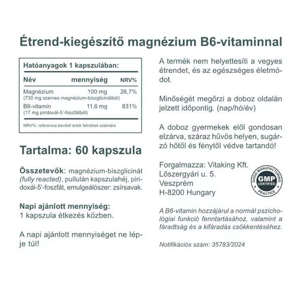 magnézium-biszglicinát, pullulán kapszulahéj, piridoxál-5’-foszfát, emulgeálószer: zsírsavak