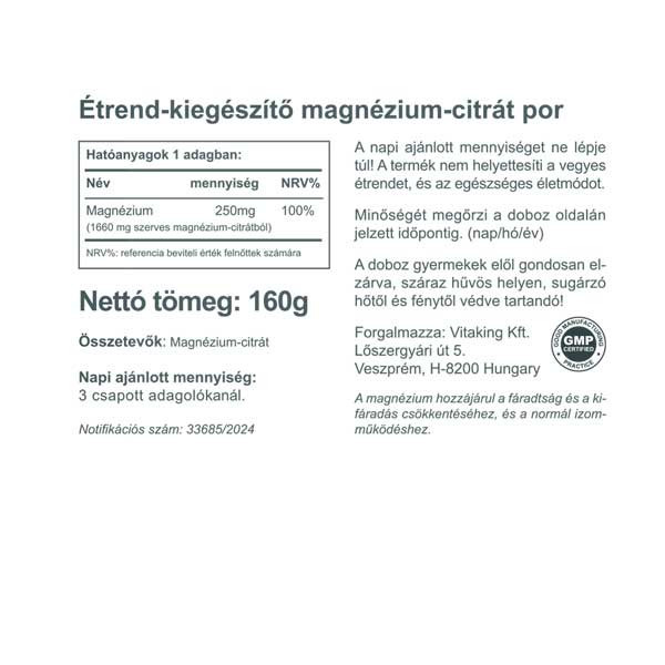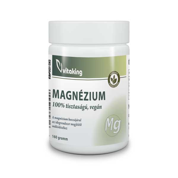 Kevés ember van tudatában annak, hogy mennyire fontos ez az ásványi anyag. Az oxigén, a víz és a fő tápanyagok (zsír, protein, szénhidrátok) után, a magnézium a talán egyik legfontosabb építőelem, amire a szervezetnek szüksége van. A magnézium egy létfontosságú ásványi anyag a szervezet számára. A Vitaking magnézium készítménye 160 g magnézium port tartalmaz. Napi ajánlott mennyisége (3 csapott adagoló kanál) megfelel 250mg elemi magnéziumnak.