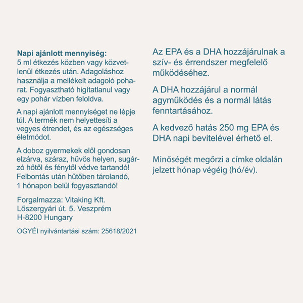 Napi ajánlott mennyiség: 5 ml omega-3 olaj étkezés közben vagy közvetlenül étkezés után. Adagoláshoz használja a mellékelt adagoló poharat. Fogyasztható higítatlanul vagy egy pohár vízben feloldva.