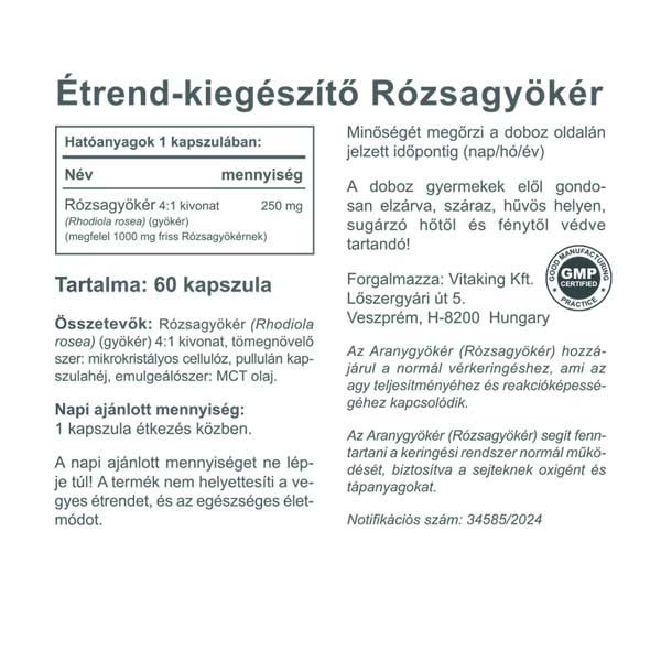 Összetevők: Rózsagyökér (Rhodiola rosea) (gyökér) 4:1 kivonat, tömegnövelő szer: mikrokristályos cellulóz, pullulán kapszulahéj, emulgeálószer: MCT olaj