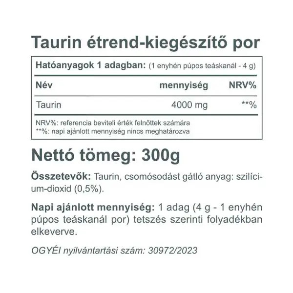 Taurin (99,5%), csomósodást gátló anyag: szilicium-dioxid (0,5%).