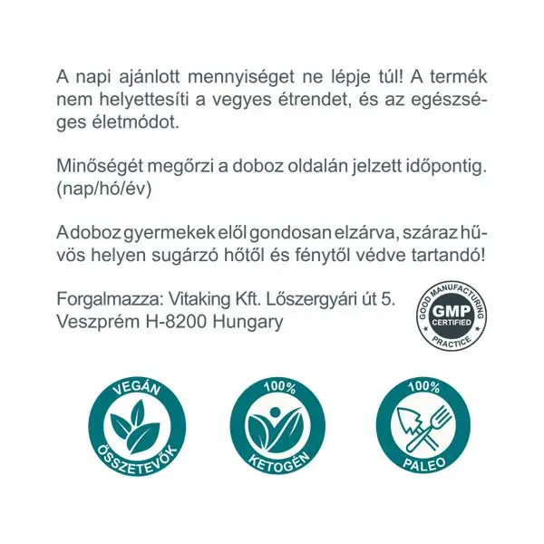 Az ajánlott napi fogyasztási mennyiséget ne lépje túl! Az étrend-kiegészítő nem helyettesíti a kiegyensúlyozott vegyes étrendet és az egészséges életmódot!
