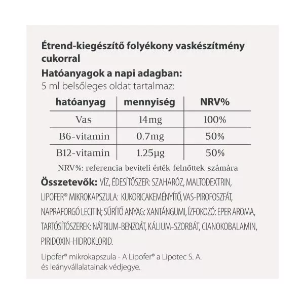 Összetevők: VÍZ, ÉDESÍTŐSZER: SZAHARÓZ, MALTODEXTRIN, LIPOFER® MIKROKAPSZULA: KUKORICAKEMÉNYÍTŐ, VAS-PIROFOSZFÁT, NAPRAFORGÓ LECITIN; SŰRÍTŐ ANYAG: XANTÁNGUMI, ÍZFOKOZÓ: EPER AROMA, TARTÓSÍTÓSZEREK: NÁTRIUM-BENZOÁT, KÁLIUM-SZORBÁT, CIANOKOBALAMIN, PIRIDOXIN-HIDROKLORID.