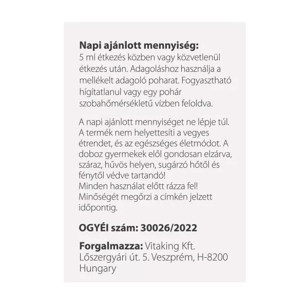 5 ml étkezés közben vagy közvetlenül étkezés után. Adagoláshoz használja a mellékelt adagoló poharat. Fogyasztható hígítatlanul vagy egy pohár szobahőmérsékletű vízben feloldva.
