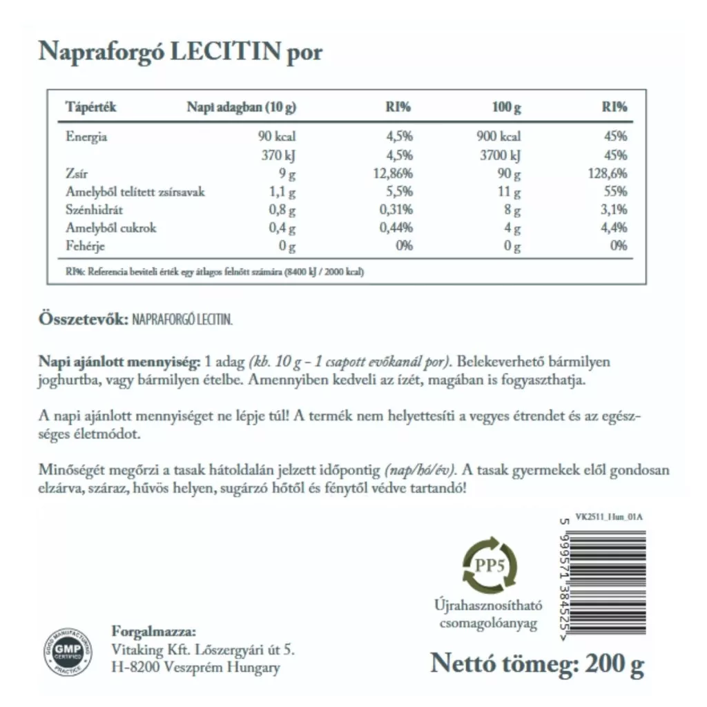 A lecitin a sejtek egyik fontos építőeleme. Természetes forrása azoknak a foszfolipideknek, amelyek alkotóelemei az agysejtek és az idegsejtek membránjainak. A Vitaking Napraforgó Lecitin por 100%-ban napraforgóból származik, GMO-mentes, szójától mentes, így ideális választás azoknak, akik érzékenyek a szójára.