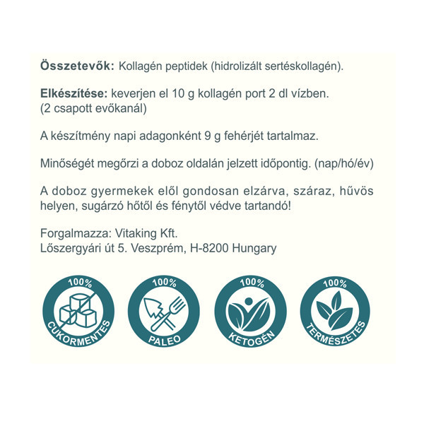 A kollagén a természetben előforduló fehérje, az állatvilág legelterjedtebb fehérjéje. A Vitaking Sertéskollagén 10 g kollagént tartalmaz napi adagonként. Cukormentes, paleo, ketogén és 100% természetes készítmény. Nem tartalmaz semmi mást csak hidrolizált sertéskollagént.
