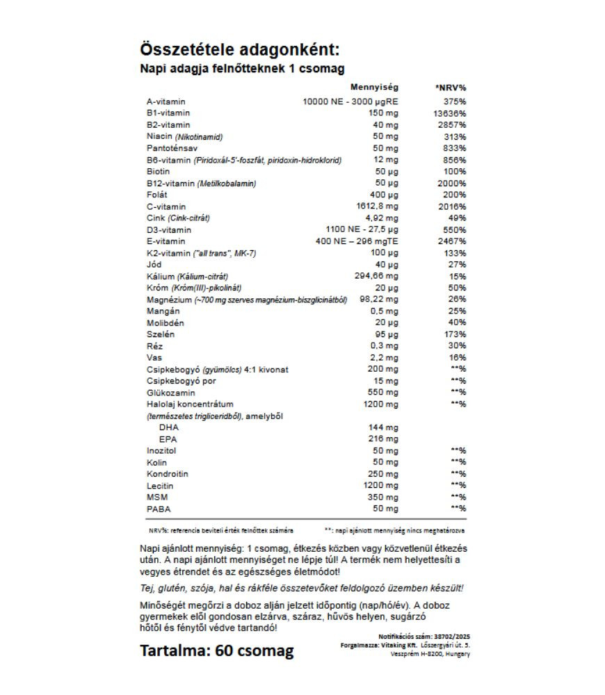 A vitaminok és ásványi anyagok mellett továbbra is minden napi adagban megtalálható Omega-3 természetes triglicerid halolajból, Lecitin, Glükozamin, Kondroitin, Csipkebogyó és MSM, hogy átfogó támogatást nyújtson minden nap.