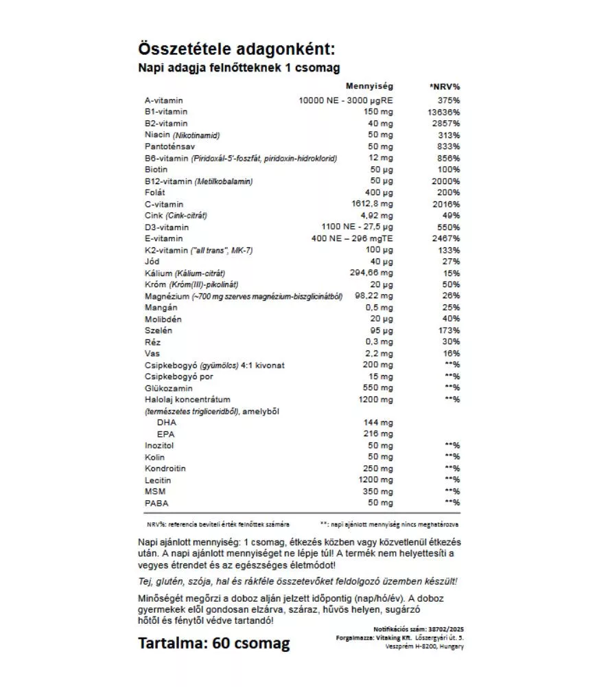 A terméket gyártó Vitaking Kft. GMP (Jó Gyártási Gyakorlat) előírásai szerint működtetett minőségirányítási rendszert alkalmaz, amely biztosítja a gyártási folyamat átláthatóságát, az alapanyagok tisztaságát és a késztermékek megbízható, állandó minőségét.