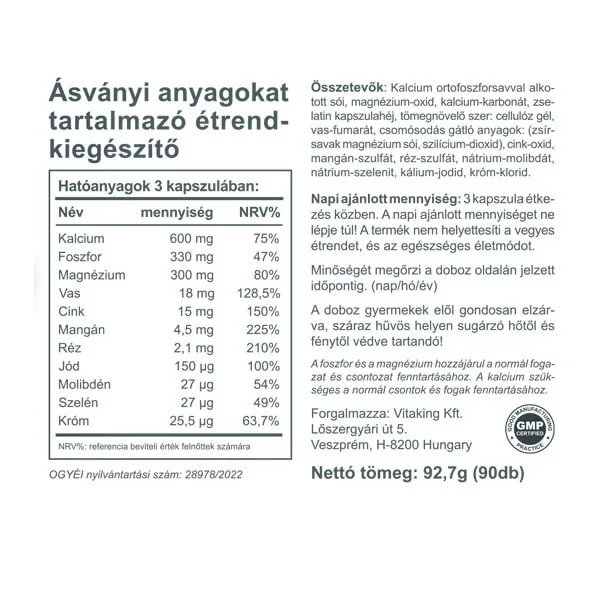 A készítmény 11-féle ásványi anyagot és nyomelemet tartalmaz, köztük kalciumot, magnéziumot, cinket, vasat, foszfort, mangánt, rezet, jódot, szelént, krómot és molibdént.