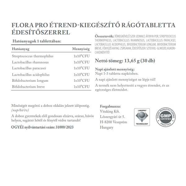A Vitaking FloraPro termék egy szabadalmaztatott bevonási eljárással készült élőflórát tartalmazó rágótabletta.