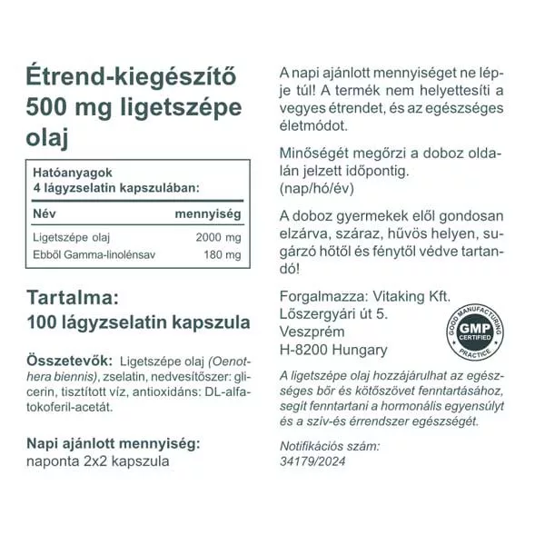 A Vitaking készítmény napi adagja (4 kapszula) 2000mg ligetszépe olajat tartalmaz, melyből Gamma-linolénsav 180mg.