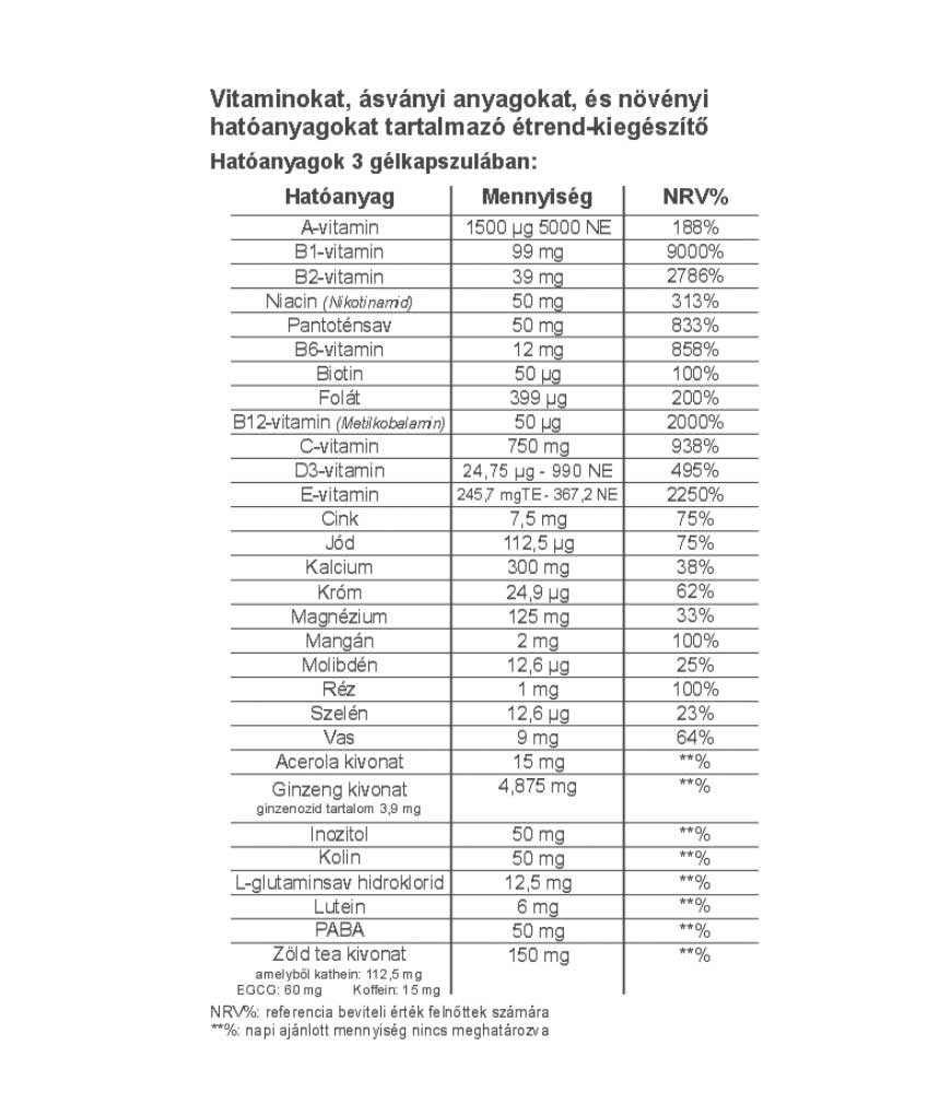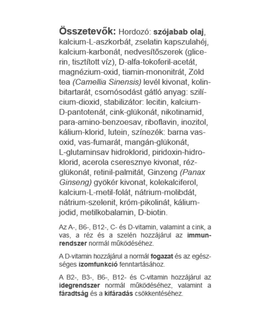 Szójabab olaj, kalcium-L-aszkorbát, zselatin kapszulahéj, nedvesítőszer: glicerin, kalcium-karbonát, D-alfa-tokoferil-acetát, magnézium-oxid, tiamin-mononitrát, Zöld tea (Camellia Sinensis) levél kivonat, tisztított víz, kolin-bitartarát, emulgeálószer: lecitin, korall kalcium, D-kalcium-pantotenát, cink-glükonát, fényező anyag: méhviasz, niacinamid, para-amino-benzoésav, riboflavin, inozitol, kálium-klorid, lutein olaj készítmény: napraforgó olaj, lutein, antioxidánsok: napraforgó lecitin, tokoferolban gazdag kivonat), piridoxin-hidroklorid, vas-fumarát, mangán-glükonát, L-glutaminsav hidroklorid, Acerola: (Acerola (Malpighia emarginata) kivonat, maltodextrin), színezék: vas-oxidok és vas-hidroxidok, réz-glükonát, A-vitamin készítmény: (retinil-palmitát, napraforgó olaj, antioxidánsok: Dl-alfa-tokoferol, BHT), Panax ginseng kivonat, D3-vitamin készítmény: (MCT olaj, kolekalciferol, antioxidáns: Dl-alfa-tokoferol), kalcium-L-metilfolát, csomósodást gátló anyagok: kalcium-karbonát, maltodextrin, nátrium-molibdát, nátrium-szelenit, króm-pikolinát, kálium-jodid, metilkobalamin, biotin.